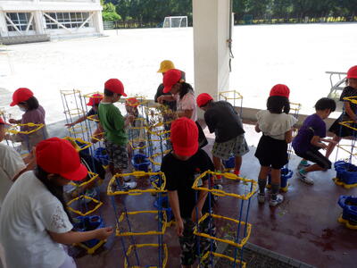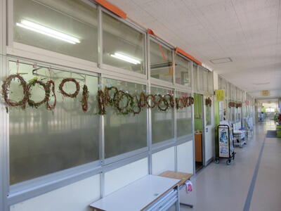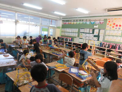 昨日1年1組、今日1年2組が、1学期・夏休みに一生懸命育てたあさがおのツルを使ってリースの土台作りをしました。支柱に絡まったあさがおのツルを取ることが難しそうでしたが、クラスの仲間と協力して無事に終えることができました。
