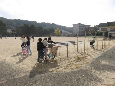 12月となり肌寒い中、昼休みの時間には、元気いっぱいに外で遊ぶ子供たちの声が聞こえてきます。特に低学年は一輪車遊びが大好きです。佐々小学校には一輪車がたくさんあり、低学年から高学年まで多くの子どもたちが遊んでいます。一輪車の補助手すりを使って遊ぶ子もいれば、補助なしですいすい一輪車を漕ぐ子もいて、とても楽しそうです。これからも、安全に気を付けて、楽しく遊びましょう。