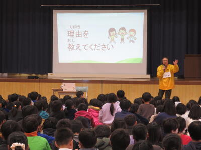 昨日の2時間目、人権集会が行われました。今年も人権擁護委員の方々に来ていただき、人権について様々なことを学びました。途中、手を挙げて自分の意見を発表する場面がありましたが、その際にはたくさんの子どもたちが手を挙げ発表していました。発表した後は、発表者のことを尊重し、周りの子どもたちがあたたかい拍手を送っていました。このように、これからも他人を尊重するあたたかい気持ちを大切にして欲しいと思います。お忙しい中ご来校いただきました人権擁護委員の皆様、ありがとうございました。