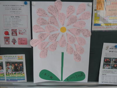 佐々小学校では現在各クラスで、自分のクラスの仲間や、他のクラスや学年の仲間に「ありがとう」の気持ちを伝える“人権の花”という取組を行っています。この取り組みでは、日頃の感謝を伝えることを目的に、花びらの形の用紙に感謝の気持ちを伝えるメッセージを書き、設置されたポストに投函します。花びらはその後模造紙に貼り、1つの大きな花を作ります。花びらの色は2種類あり、ピンクの花びらは自分のクラスの仲間へ、黄色の花びらは他のクラスの仲間へのメッセージです。たくさんの花びらが集まって、ありがとうの花が綺麗に咲いて、感謝の気持ちがみんなに届くといいなと思います。