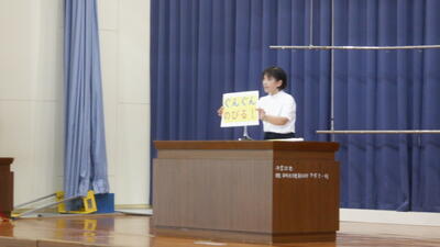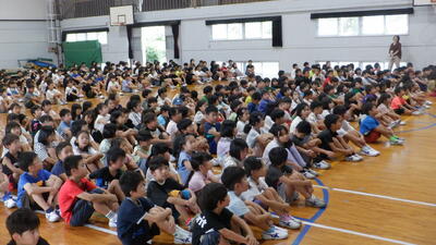 体育館で始業式を行い、校長先生からお話がありました。まず、夏休みの間に2階の廊下の壁が塗装されたことや、PTA親子清掃で教室や廊下の窓をきれいに拭いたこと、シルバー人材センターの方が運動場の草刈りをしてくださったことなど、2学期に向けて環境整備がされたことの報告がありました。それから、1年間で一番長い学期の2学期を「自分でぐんぐん、みんなとぐんぐん伸びる学期」にしましょうというお話がありました。その後「これまで続けてきた『伝え合いの学習』や『GGタイム』などの、佐々小学校のよさをつないでいこう」「挨拶を『大きな声で』『自分から』『笑顔で』でしよう」「校外学習や地域学習での出会いを大切にしよう」というお話をしていただきました。