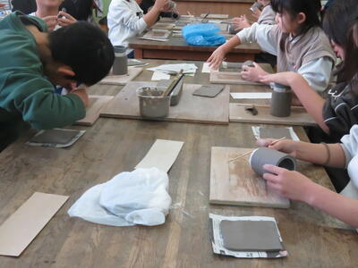 今週月曜日、4年生が陶芸体験を行いました。今回制作したのは湯呑です。陶芸という専門的な体験でしたが、講師の新井憲彦先生に分かりやすく教えていただき、子どもたちは楽しく陶芸活動を行うことができました。特に湯呑の形作りの際には、みんな真剣に作業をしていて、良いものを作り上げたいという気持ちがとても伝わってきました。新井先生、子どもたちに楽しく陶芸を教えていただき、本当にありがとうございました。